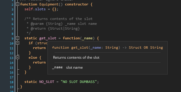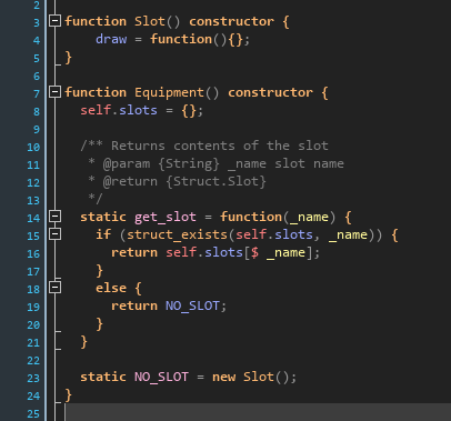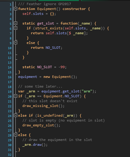 Here, we're using a static on the Equipment constructor to keep the value nicely namespaced, but we could equally use a #macro NO_SLOT -99 instead. Two different ways of achieving the same thing but with slightly different impact on code organization. Sometimes one is better than the other.