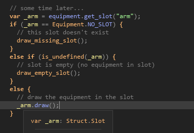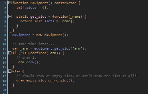 Take for example an equipment slot system you build where you want to get what equipment is in the character's equipment slot with equipment.get_slot("arm") and this returns undefined. Does that mean there's no equipment in the arm slot, or does it mean that the arm slot itself doesn't exist on this character? It's ambiguous.