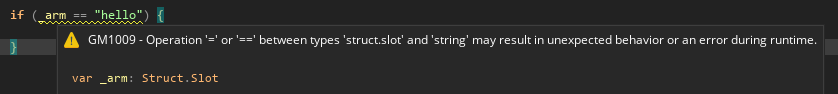 Importantly, Feather is now happy. It can correctly infer that _arm is a Struct.Slot, and it will bring up all the correct method definitions associated with it, even giving us an error if we try to do an invalid type operation