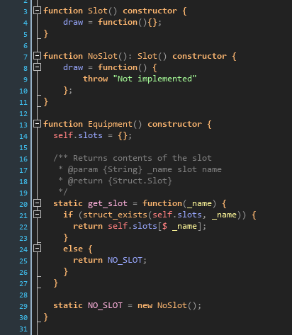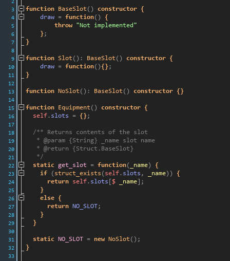 Now, NO_SLOT is an instance of the new NoSlot constructor that inherits from Slot, so it can be used as the same type (feather is okay returning a NoSlot where the function signature requires Slot). But any time you try to draw(), you'll get a crash, and you're free to put whatever error message you want in there that is maximally descriptive of how it fucked up.