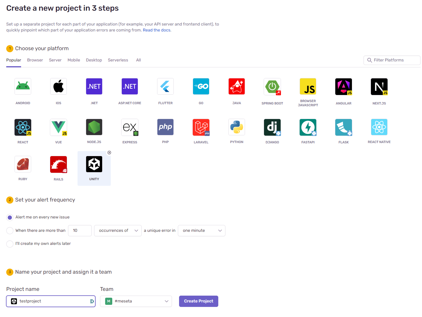 To start collecting bug reports like this, first step is to go register for an account at sentry.io. Then, when it comes to creating a new project, you'll see the following: