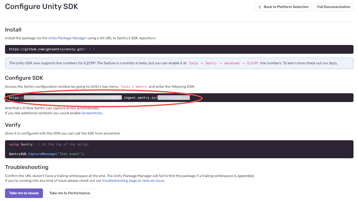 In the next screen, it'll show you your DSN. This is the unique ID for your project which you need to use to make sure that reports submitted from your game end up in your account. Copy this. This value is also available in the project settings should you need it later.