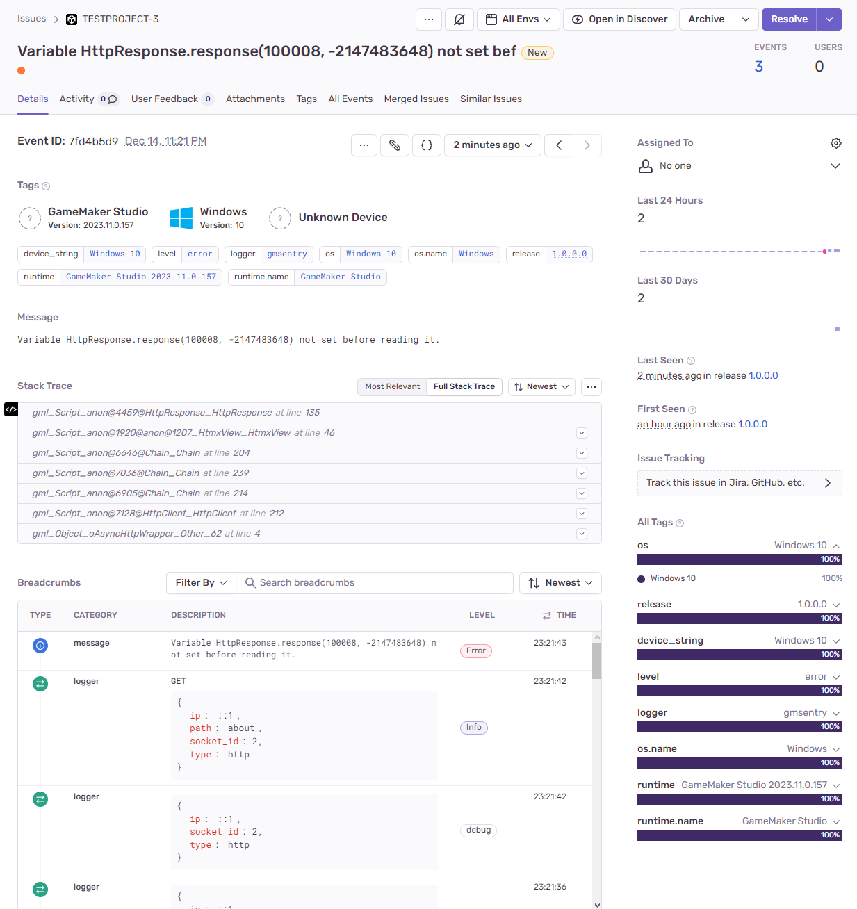 I'm spending this blog post talking about how to set up Sentry to serve as a hub to receive logs and crash reports that your game may generate. You can grab a copy of the script from my Sentry library over here. Grab the downloadable yymps file from the latest version