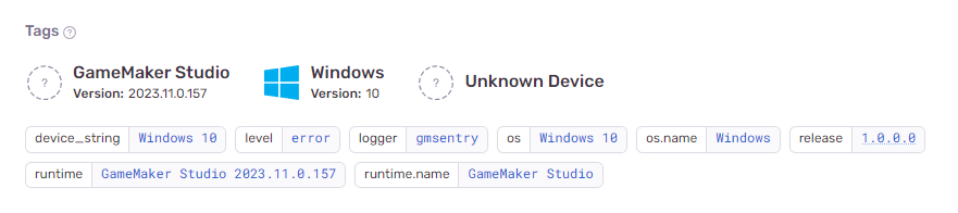 This top part of the report shows a bunch of "tags". Tags are key/value fields that allow you to group reports by OS, type, version, and even user. If you use my Sentry library, it'll automatically fill some information in here like the detected OS and runtime version, and the game's release version. But you can add more information here if needed.