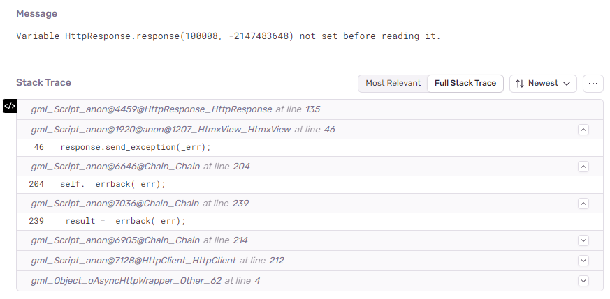 Of course the main thing we want to know about the crash is the error message and stacktrace. This part of the report contains both, and it's the same message you'll get from the GameMaker crash dialogue