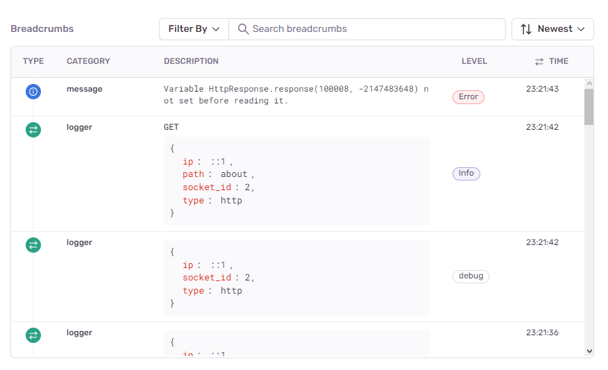 Breadcrumbs are an underappreciated feature of logging. If you use my Sentry library, every time you use the logger (stuff like logger.info() ) it'll save that log line to an array, ready to be included in a report if it crashes. This will give you some important contextual information about what might have been going on in the game just before the crash.