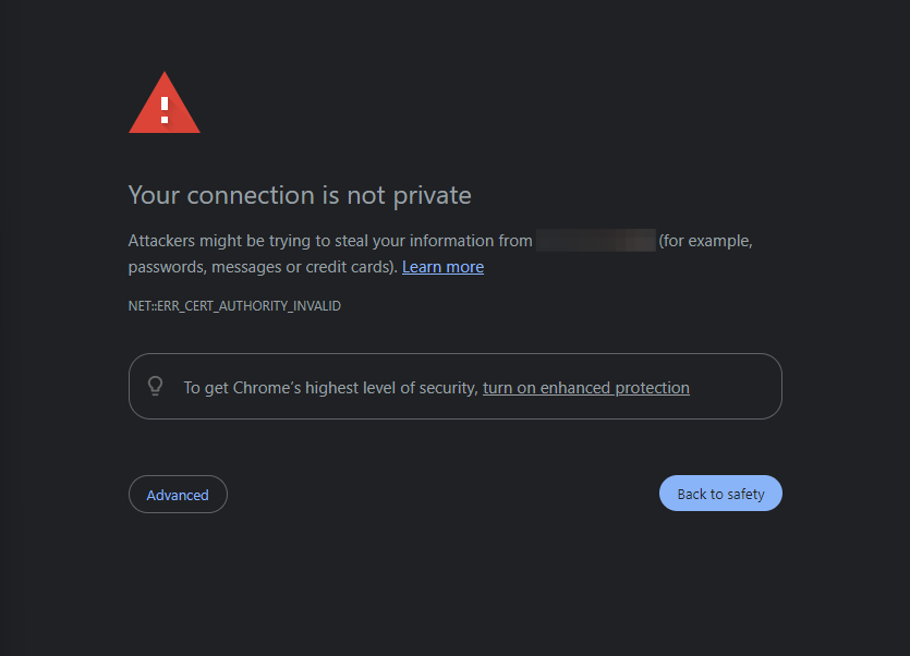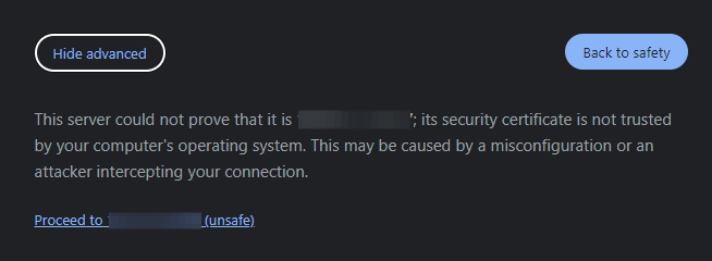 And put it into the URL of your browser, adding port 8443, which is the port where SKGM's web UI is hosted: https://xx.yy.zz.ww:8443. You will see this, but don't panic!