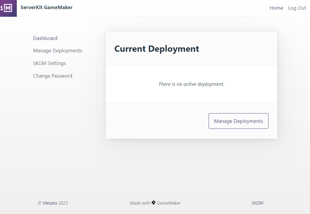 After you set up your password, and log in with it. You'll see the Dashboard. This is where your running gamemaker server will show up. For now, it's empty. Click on Manage Deployments to get to your deployment list: