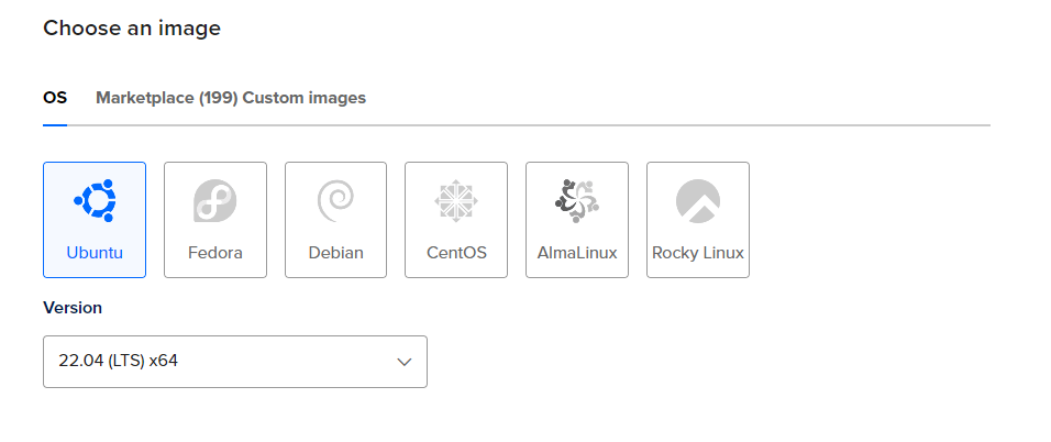 In the next Choose an image section, pick Ubuntu, and, unlike the previous post, this time let's pick 22.04 (LTS) x64. The reason for this is it's a slightly newer version, and this time I made sure my setup script supports this version.