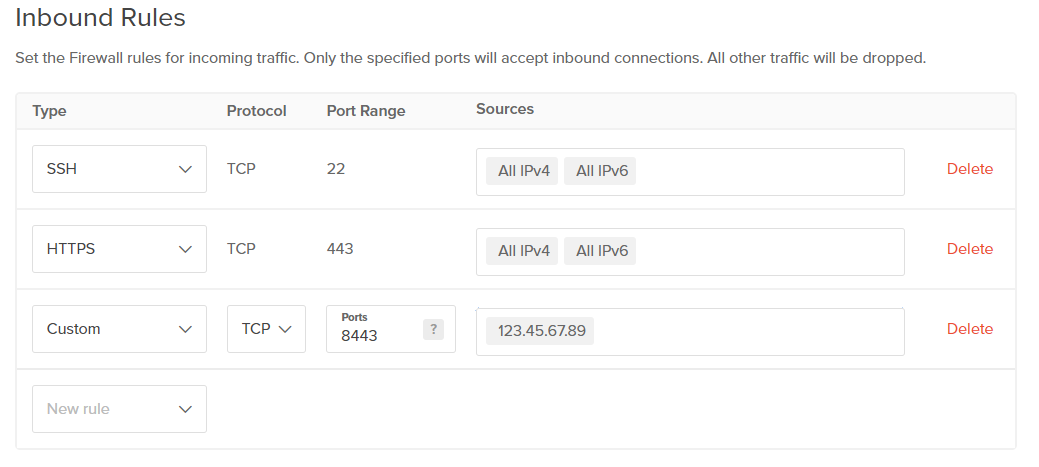 This time, the firewall is a bit different as we need to add port 8443 for the SKGM admin console. For extra security, you could change the Sources for that port to your own IP address, which will prevent anyone else outside from accessing the admin console. This is desirable, since if someone breaks in, they would potentially be able to run whatever they want on your server.